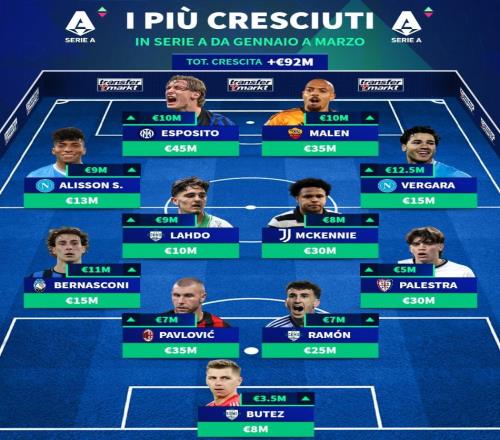 北京時(shí)間3月24日,在更新了意甲球員的身價(jià)之后,德轉(zhuǎn)統(tǒng)計(jì)出了此次更新后身價(jià)漲幅最高的10名球員,那不勒斯的韋爾...