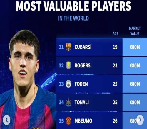 北京時間3月29日,在更新了歐洲五大聯(lián)賽球員的身價之后,德轉(zhuǎn)列出了目前身價足壇身價排名前50的球員,亞馬爾、哈...