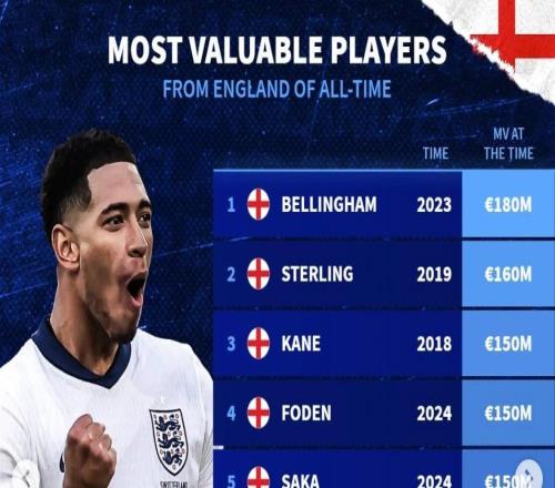北京時間3月31日,德轉列出了英格蘭球員歷史身價榜,貝林厄姆1.8億歐元第一,斯特林1.6億歐元第二,哈里-凱恩、福登...