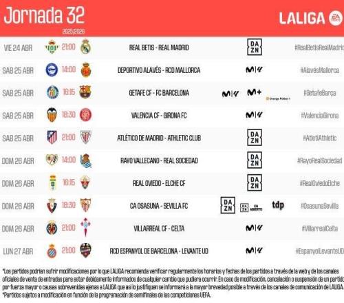 北京時(shí)間4月4日,西甲官方公布了聯(lián)賽第32輪各場(chǎng)比賽的具體開球時(shí)間。西甲第32輪開球時(shí)間(以下均為北京時(shí)間):4...