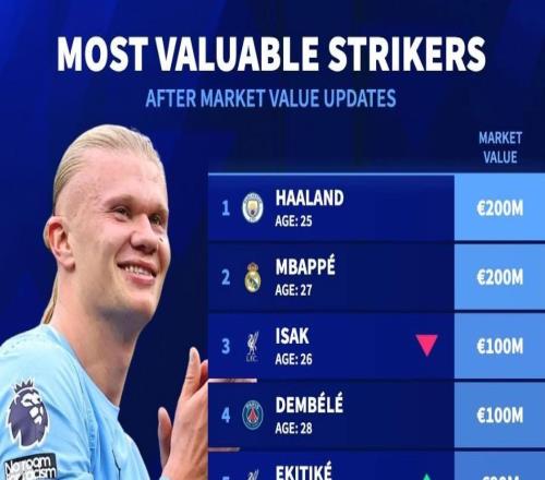 德轉(zhuǎn)前鋒身價前10:哈蘭德、姆巴佩2億歐領(lǐng)銜,伊薩克1億第3