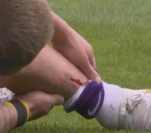 慎入,熱刺舊將霍爾特比在荷甲賽場(chǎng)上小腿被踢出一道血口