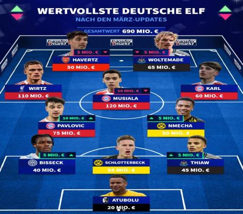 北京時(shí)間3月30日,在更新了歐洲五大聯(lián)賽球員的身價(jià)之后,德轉(zhuǎn)列出了德國(guó)球員最貴11人陣容,身價(jià)1.2億歐元的穆西亞...