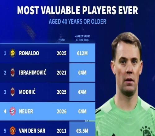 北京時(shí)間3月28日,德國轉(zhuǎn)會(huì)市場(chǎng)統(tǒng)計(jì)了足壇史上40歲及以上球員的身價(jià)榜單,C羅以1200萬歐元高居榜首。足壇歷史40...