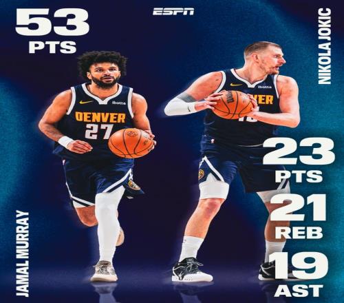 掘金的雙核一同爆炸,約基奇拿到23分21籃板19助攻的超級三雙,穆雷則拿到53分+9個(gè)三分球,掘金擊敗獨(dú)行俠拿到四連勝,掘金維持了西部第四的席位。