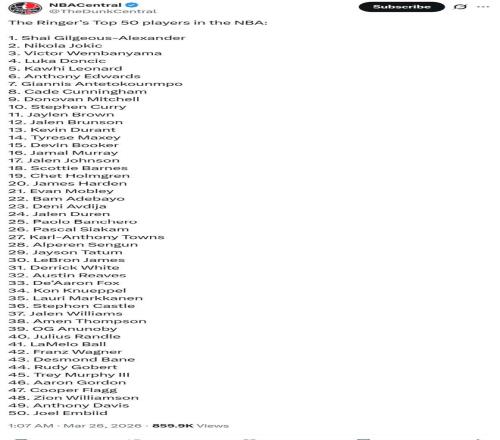 1-10名:SGA、約基奇、文班、東契奇、小卡、華子、字母哥、坎寧安、米切爾、庫(kù)里