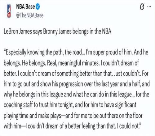 “這是真實(shí)且有意義的出場時(shí)間,沒有比這更好的結(jié)果了,真的沒有,”詹姆斯說道,“他走上場,我的意思是顯然他……在這近一年半的時(shí)間里,他的進(jìn)步有目共睹。也證明了他為什么配得上在這個(gè)聯(lián)盟打球,以及他能在這個(gè)聯(lián)盟做到什么。所以,教練組今晚信任他,給他大量出場時(shí)間,還讓他完成了幾次精彩的配合——而我能和他并肩站在球場上,這種感覺……真的沒有比這更好的了,真的沒有?!?/p>