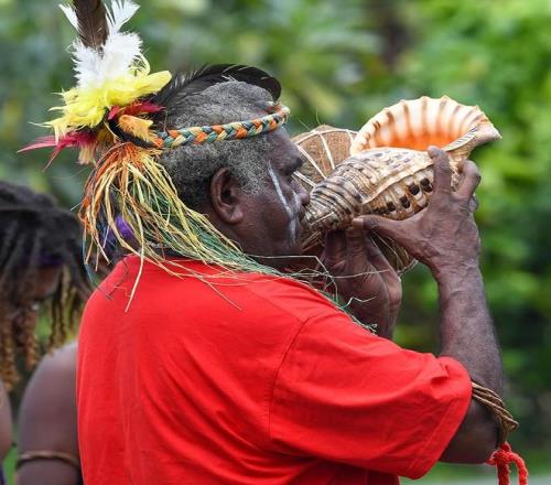 來(lái)自家鄉(xiāng)的信物,新喀里多尼亞隊(duì)附加賽前攜帶海螺等飾品合照