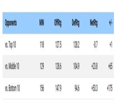 這套首發(fā)確實“虐”了不少弱隊:404分鐘里有39%(156分鐘)面對聯(lián)盟倒數(shù)十隊,期間凈勝175分。但他們面對中游球隊同樣不差,面對聯(lián)盟前十球隊118分鐘里沒有輸分,還凈勝1分。