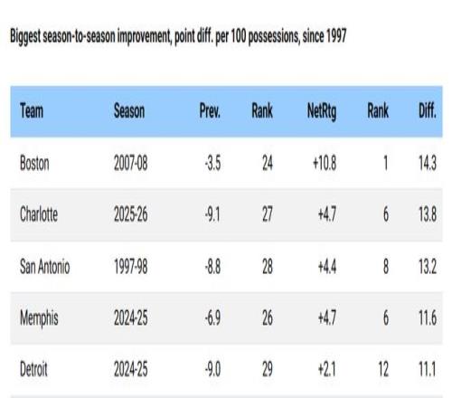 在這場勝利前,黃蜂本賽季百回合凈勝分仍達(dá)到+4.7分,聯(lián)盟第六。而上賽季他們百回合凈負(fù)9.1分,聯(lián)盟倒數(shù)第四。這13.8分的百回合凈勝分飛躍,是NBA有詳細(xì)逐回合數(shù)據(jù)統(tǒng)計30年以來,第二大的單賽季進(jìn)步幅度,僅低于2007-08賽季的凱爾特人(提升14.3分)。