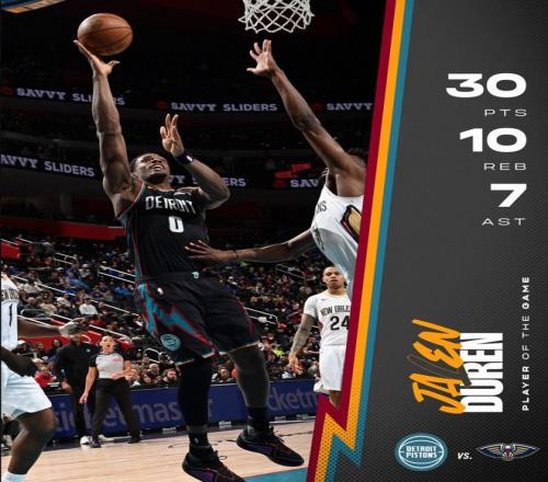 北京時(shí)間3月27日,底特律活塞129-108擊敗新奧爾良鵜鶘避免連敗。這場(chǎng)比賽活塞在第二節(jié)打出34-23的高潮一舉拉開差距,杜倫在籃下打出統(tǒng)治級(jí)的表現(xiàn),而且他遭遇包夾后還能分出球權(quán)助攻隊(duì)友。