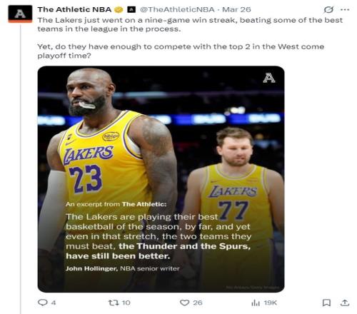 換言之湖人本賽季達(dá)成52勝+西部前三號種子就有沖冠概率,而且文中還提到:詹姆斯、東契奇、里夫斯的化學(xué)反應(yīng)在不斷改善。洛杉磯剛剛找到了勒布朗與里夫斯之間的正確平衡,加上肯納德交易到來后球隊(duì)板凳席能力的提升,湖人在西部的確有沖冠的可能性。