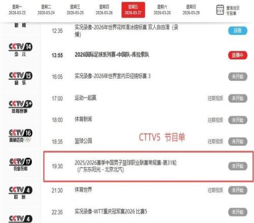 根據(jù)CBA官方賽程,3月27日第31輪多場(chǎng)常規(guī)賽統(tǒng)一安排在19時(shí)35分開賽,央視CCTV5原計(jì)劃亦按此節(jié)點(diǎn)進(jìn)行轉(zhuǎn)播。此次卻破例將廣東東陽光對(duì)陣北京北汽的焦點(diǎn)戰(zhàn)提檔至19時(shí)30分,較既定開球時(shí)間提前整整五分鐘。
