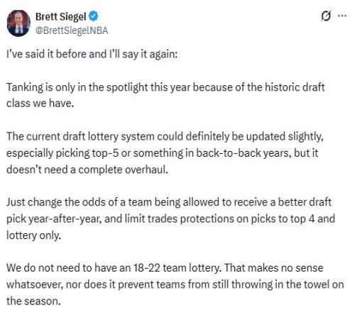打進(jìn)季后賽的球隊(duì),完全不該有任何機(jī)會拿到樂透簽。這根本不是解決現(xiàn)有制度問題的正確方式。這么改只會讓那些真正缺乏天賦、贏不了球的球隊(duì),變強(qiáng)的機(jī)會變得更小,最后永遠(yuǎn)陷入爛隊(duì)泥潭。