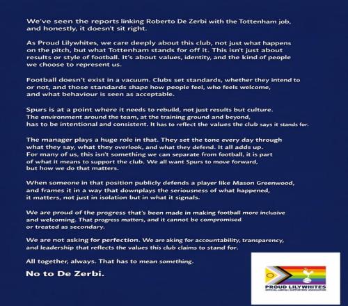 三家托特納姆熱刺球迷協(xié)會聯(lián)合發(fā)聲,反對俱樂部聘德澤爾比出任一線隊主帥,核心原因是這名意大利教練曾公開力挺格林伍德。