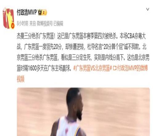 導(dǎo)演20分大逆轉(zhuǎn)!趙睿一雪前恥,有人卻尷尬了,郭士強(qiáng)還敢?guī)麊?/h1> 后仰大風(fēng)車 CBA常規(guī)賽第31輪,萬(wàn)眾矚目的京粵二番戰(zhàn),廣東主場(chǎng)迎戰(zhàn)北京北汽,打出了一場(chǎng)讓人意想不到的神劇情,上半場(chǎng)廣東隊(duì)一度領(lǐng)先北京20分,但頑強(qiáng)的北京男籃憑借趙睿、杰曼、斯佩爾曼、麥基的出色發(fā)揮,在下半場(chǎng)瘋狂追分,末節(jié)兩隊(duì)比分持續(xù)緊咬,薩姆納張才仁接連在最后階段飚進(jìn)關(guān)鍵三分,杰曼則在比賽最后16.7秒內(nèi)打進(jìn)致勝三分絕殺,幫助北京客場(chǎng)以96-93險(xiǎn)勝,賽季雙殺廣東隊(duì)的同時(shí),也終結(jié)了自2012-13賽季以來(lái)在東莞客場(chǎng)對(duì)廣東的連敗紀(jì)錄,而這也是廣東隊(duì)本賽季第4次被絕殺。