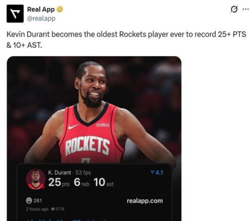 憑借這樣的表現(xiàn),37歲180天的杜蘭特成為火箭隊史單場至少得到25分10助最老的球員,同時繼續(xù)保持本賽季杜蘭特助攻上雙火箭不敗的金身。