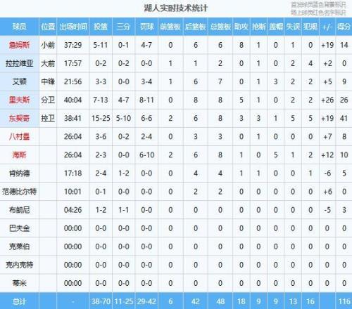 湖人隊:東契奇41分8板3助3斷、里夫斯26分8板5助、詹姆斯14分6板8助、海斯10分8板1助5帽、艾頓9分7板3帽、八村塁8分3板、肯納德5分4板1助、布朗尼3分