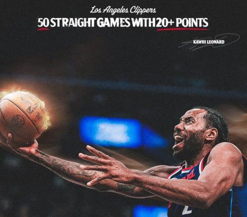 此役倫納德又一戰(zhàn)創(chuàng)造多項紀(jì)錄:1.他完成連續(xù)50場比賽20+生涯新高;
