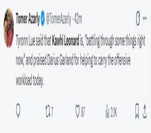 賽后泰倫盧這樣評價小卡:他正在處理一些傷勢,所以加蘭在進(jìn)攻端承擔(dān)了更多責(zé)任。
