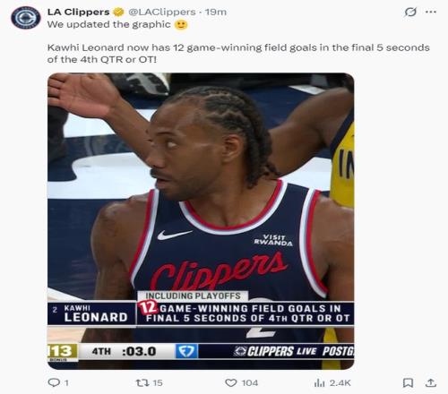 快船官方給出一項數(shù)據(jù),科懷-倫納德生涯在第四節(jié)或加時賽最后五秒,共計命中12記絕殺/準(zhǔn)絕殺進(jìn)球!