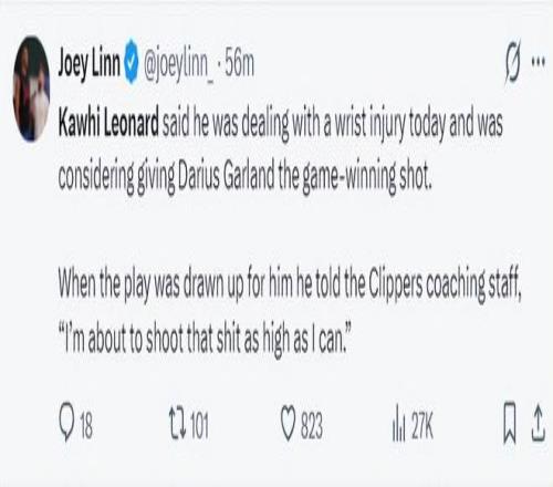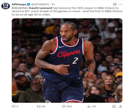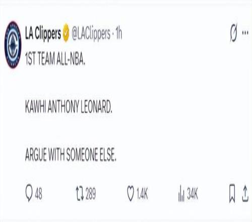 快船官方寫道:倫納德應(yīng)該進(jìn)入最佳一陣,倫納德無可爭議的一陣。
