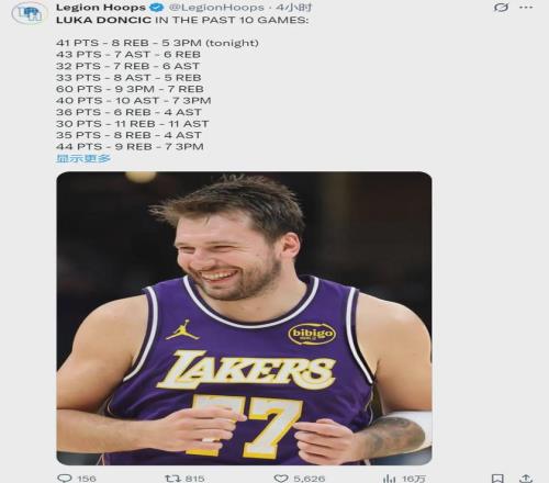 東契奇本賽季已經(jīng)15次單場砍下40+,同樣斷檔領跑全聯(lián)盟,第二是愛德華茲的10場,第三是亞歷山大的7場。此外,東契奇已經(jīng)連續(xù)12場砍下30+,湖人隊史第四人,前三個分別是埃爾金-貝勒、杰里-韋斯特和科比-布萊恩特。