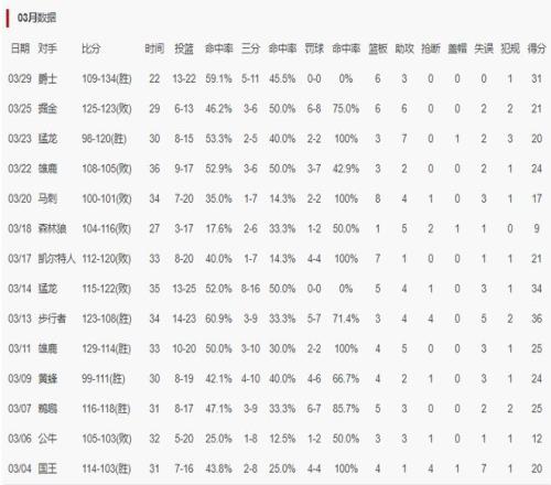 杰倫-格林整個三月份的狀態(tài)呈現(xiàn)回暖的趨勢,這個月14場比賽有11場20+與三場30+,這個月杰倫-格林場均31.3分鐘,拿到22.2分4.2籃板3.4助攻1.1搶斷0.2蓋帽,命中率43.8%,三分命中率33.3%。(最近四場比賽都拿到20+且只有一場命中率不足五成)