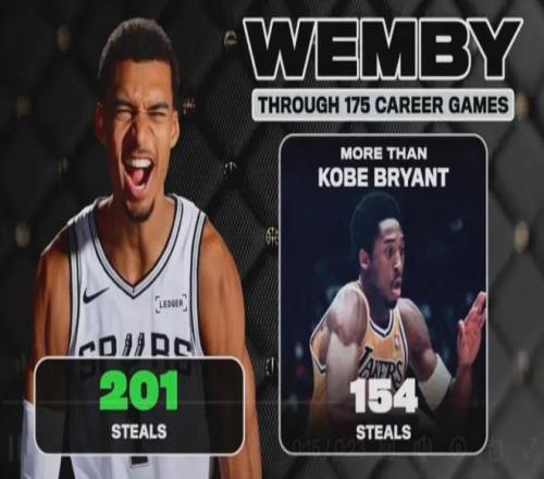在搶斷方面,文班亞馬以201個(gè)超越了科比的154個(gè)。