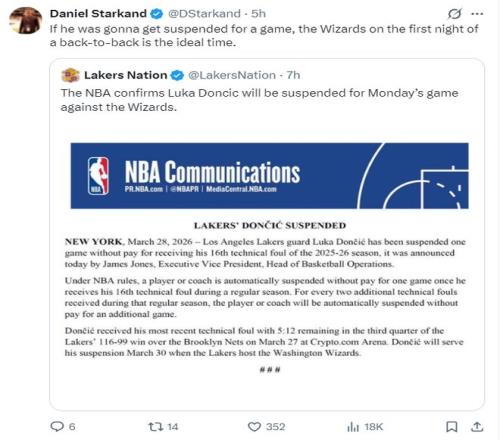 北京時間3月29日,NBA官方宣布,因?yàn)楸R卡-東契奇累計16次技術(shù)犯規(guī),他將自動禁賽一場,湖人下一場對陣奇才的比賽他無法出戰(zhàn)。