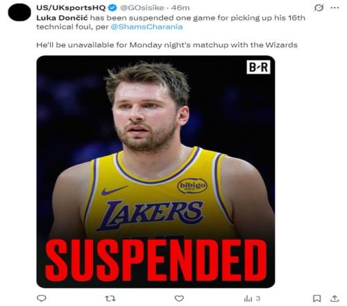 北京時間3月29日,NBA官方宣布,因?yàn)楸R卡-東契奇累計(jì)16次技術(shù)犯規(guī),他將自動禁賽一場,湖人下一場對陣奇才的比賽他無法出戰(zhàn)。