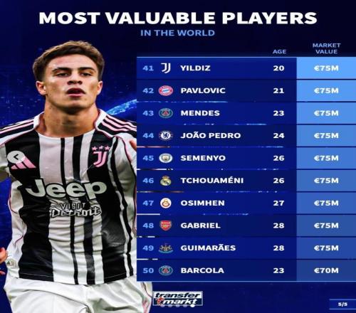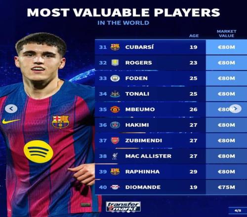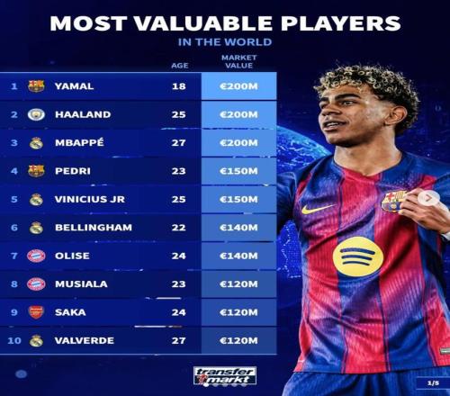 北京時間3月29日,在更新了歐洲五大聯(lián)賽球員的身價之后,德轉(zhuǎn)列出了目前身價足壇身價排名前50的球員,亞馬爾、哈蘭德、姆巴佩2億歐元領(lǐng)銜,共有20名球員身價過億。
