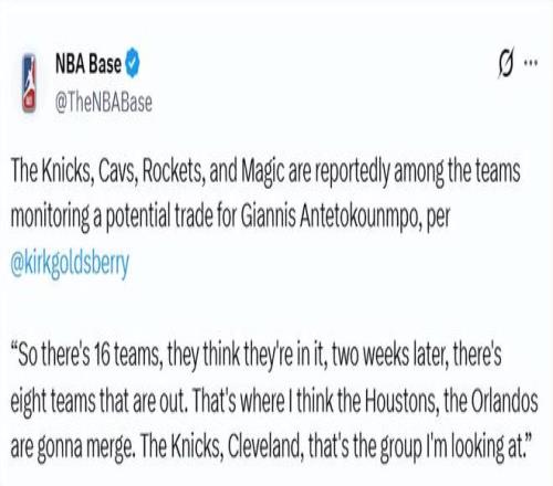 北京時間3月30日,NBA專欄作家戈茲貝里在播客節(jié)目中透露,尼克斯仍是有意通過交易引進字母哥的球隊之一。盡管他們本賽季已是東部聯(lián)盟頂級強隊之一,但仍未退出關于字母哥的交易討論。