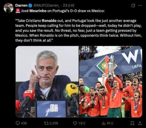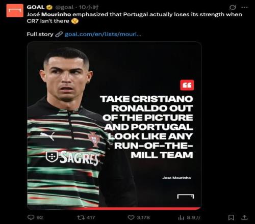今天早上,出現(xiàn)了一則穆里尼奧談C羅的新聞,稱由于葡萄牙友誼賽0-0戰(zhàn)平墨西哥,穆帥評論道:“如果C羅不在陣中,葡萄牙就只是一支普通球隊”。這篇新聞的信源是Goal平臺。(原文:)