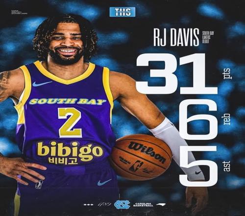 雖然NBA下來的球員星光熠熠,但南灣湖人的真核心還是RJ·戴維斯。這位前北卡球星本賽季場均轟下18.3分、4.9次助攻,三分命中率高達45.9%。他在場上的指揮若定,是這波12連勝的定海神針。