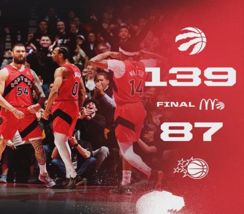 139比87,猛龍主場(chǎng)大勝魔術(shù)。