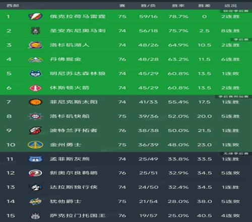 處于附加賽區(qū)的球隊分別是太陽、快船、開拓者和勇士。太陽落后前六至少4個勝場,領(lǐng)先了身后的快船2.5個勝場,他們第7的位置相對還是牢固??齑诤烷_拓者進(jìn)行的8的卡位戰(zhàn),今天快船127-113戰(zhàn)勝了殘陣雄鹿,開拓者123-88大勝弱旅奇才,快船依然領(lǐng)先開拓者1.5個勝場。下一場兩支球隊迎來正面相遇。第10的勇士落后開拓者1.5個勝場。排在最后5名的球隊分別是灰熊、鵜鶘、獨(dú)行俠、爵士和國王!