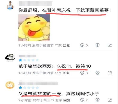 范子銘本場(chǎng)繼續(xù)被DNP,也引來了球迷的調(diào)侃:“趙睿C類合同場(chǎng)場(chǎng)30多分鐘,我范大將軍頂薪場(chǎng)場(chǎng)休息,就問你們羨不羨慕”、“范子銘怒砍兩雙!慶祝11,微笑10”、“你最舒服,在替補(bǔ)席慶祝一下就頂薪真羨慕!”
