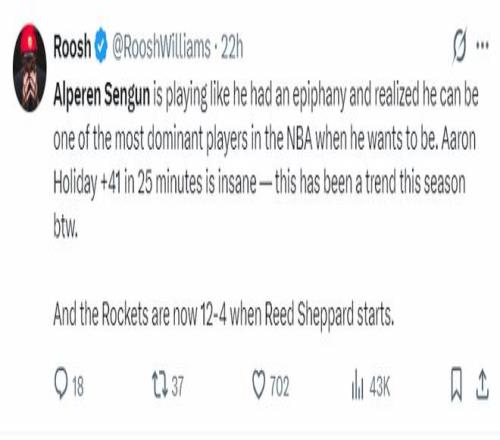 火箭隊以二連勝結(jié)束了四連客之旅,火箭也在戰(zhàn)績方面追平了西部第五的森林狼,只要森林狼再輸一場火箭就能重返西部第五。對陣鵜鶘一戰(zhàn)杜蘭特三節(jié)打卡只拿20分6助攻4籃板,而申京全場比賽32分鐘拿到36分13籃板,他才是火箭的真基石。