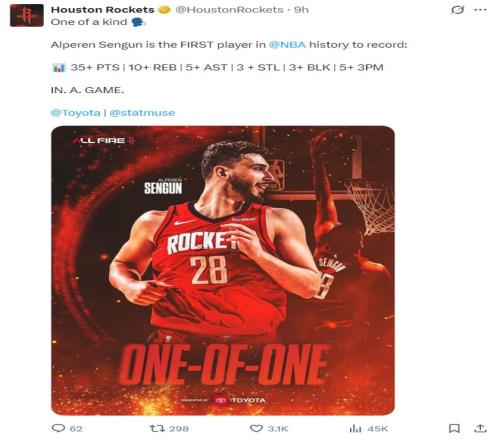 5.申京生涯第二次拿到35+10+5+5三分的球員,成為火箭隊史第二人比肩哈登;