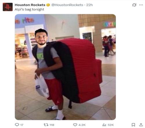 休斯頓火箭隊官方曬出申京背著巨大背包的照片盛贊他一人扛起了火箭隊。
