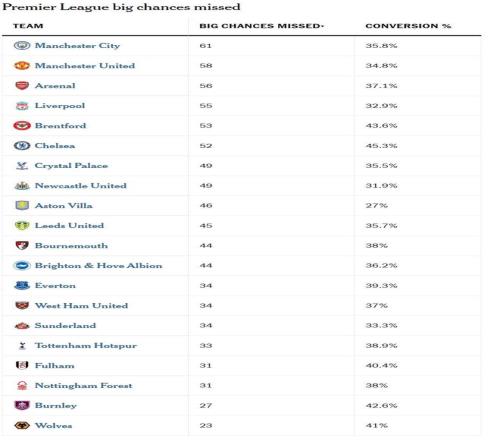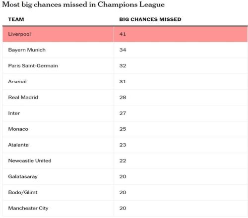 簡單來說,本賽季英超只有三支球隊——曼城、曼聯和阿森納——錯過的重大機會比利物浦更多。從某種程度上說,這并不奇怪:創(chuàng)造的機會越多,錯過的可能性就越大,而且這項數據的高位區(qū)被積分榜前列的球隊所占據。但利物浦在錯失重大機會的百分比上也排名第三差(32.9%)。
