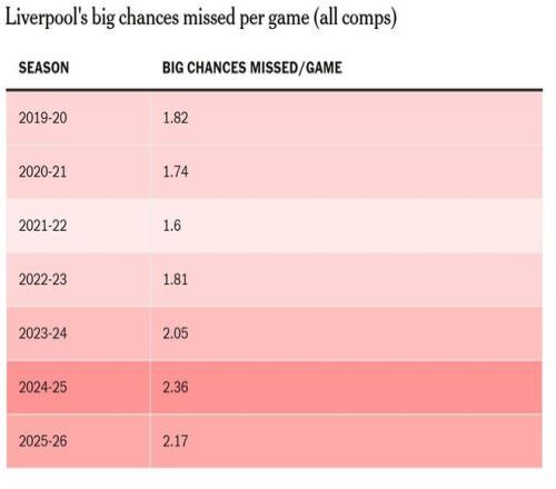 錯失機會永遠無法完全避免。盡管利物浦本賽季的揮霍無度令人沮喪,但根據Opta的定義,他們每場比賽錯過的重大機會實際上比上賽季奪冠時還略少一些。不過,這仍然是利物浦在過去七個賽季中第二浪費機會的賽季。