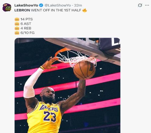 41歲的詹姆斯首節(jié)9分鐘,6中4,拿到8分2籃板2助攻,雙手暴扣技驚四座,41歲的老頭依舊可以飛天遁地,從他的表情能看出非常的堅毅。上半場打完詹姆斯17分鐘,10中6,沒有三分出手拿到14分6助攻4籃板1蓋帽,沒有東契奇的情況下他更多弧頂發(fā)牌。