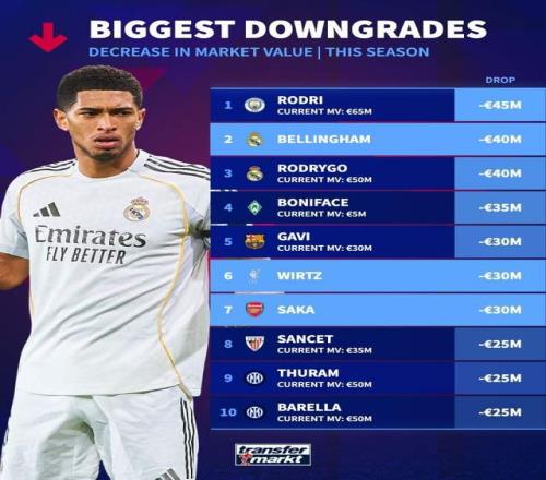德轉(zhuǎn)盤點了本賽季目前球員身價下跌榜,其中羅德里下降4500萬歐最多,貝林、羅德里戈下降4000萬歐。