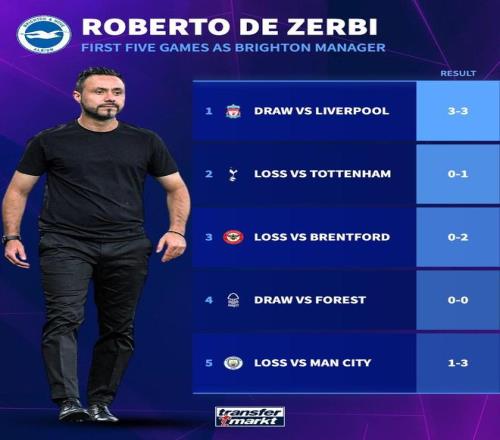 德澤爾比曾在2022年至2024年執(zhí)教英超球隊(duì)布萊頓,在這位意大利教練帶領(lǐng)的前5場(chǎng)比賽中,布萊頓一場(chǎng)未勝,戰(zhàn)績(jī)?yōu)?平3負(fù),分別戰(zhàn)平利物浦和諾丁漢森林,輸給了熱刺、布倫特福德和曼城。