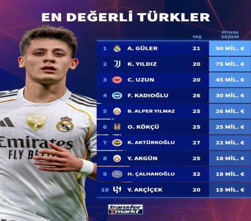 北京時間4月1日,土耳其在世預(yù)賽歐洲區(qū)附加賽的決賽中1-0小勝科索沃,順利晉級2026年美加墨世界杯正賽,德轉(zhuǎn)也列出了現(xiàn)役土耳其球員身價排行榜前10,皇家馬德里球星居萊爾以9000萬歐元高居第一,尤文圖斯的凱南-伊爾迪茲7500萬歐元第二。