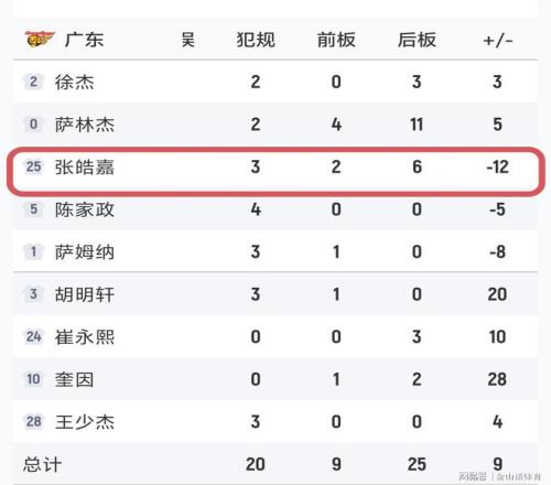 值得一提的是,本場比賽廣東隊(duì)的張浩嘉先抑后揚(yáng),在前3節(jié)進(jìn)攻端0分情況下,末節(jié)迎來爆發(fā)。此役,張皓嘉出戰(zhàn)27分鐘,投籃8中4、三分6中2得到10分8籃板,另有2助攻2蓋帽進(jìn)賬,由于張皓嘉前3節(jié)表現(xiàn)平平,所以盡量他末節(jié)獨(dú)取10分,但場上正負(fù)值為-12,仍排在全隊(duì)倒數(shù)第一。而張浩嘉此役得到10分,也是本賽季首次得分上雙……