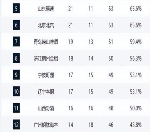 第七名青島隊(duì)(19勝12負(fù))僅落后深圳隊(duì)2個(gè)勝場,仍存沖擊前四希望;浙江隊(duì)(18勝14負(fù))與寧波隊(duì)(17勝15負(fù))分列第八、第九;遼寧隊(duì)輪空,戰(zhàn)績同為17勝15負(fù),位列第十;山西隊(duì)(16勝16負(fù))緊隨其后,季后賽席位爭奪日趨白熱化。