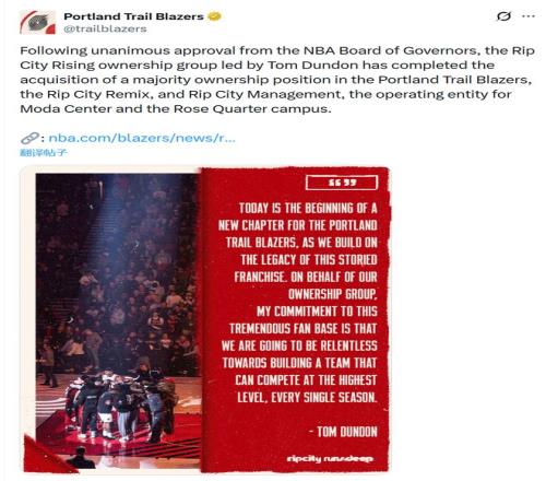 就在今天,開拓者隊(duì)官方官宣經(jīng)NBA董事會(huì)批準(zhǔn),達(dá)拉斯億萬(wàn)富翁湯姆·鄧頓所領(lǐng)導(dǎo)的Rip City Rising所有權(quán)集團(tuán)已完成對(duì)波特蘭開拓者隊(duì)、Rip City Remix 和 Rip City Management(摩達(dá)中心和玫瑰花園園區(qū)的運(yùn)營(yíng)實(shí)體)的多數(shù)股權(quán)收購(gòu)。